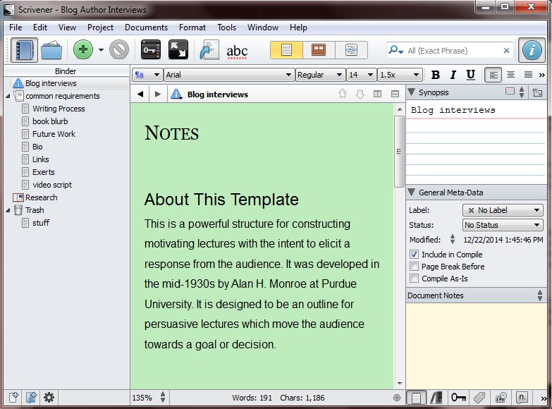 Topping the list are the two I use most. Although not free, they are affordable. First up is Scrivener: it’s a project management system as well as a word-processor by those clever folks at Literature & Latte. Priced around $40.00 US, it’s packed with features that can make almost anyone a Hemingway. What makes it unique, is the binder feature. Instead of creating one long document, you can set up each scene as its own document, you can slide them around, change their order, or write a different version without losing the first to see which one you like best.