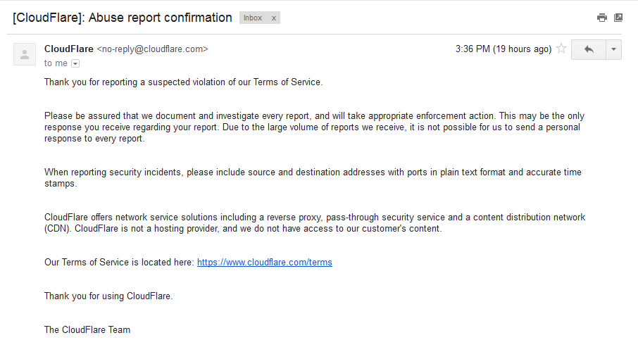 So as you can see, it looks like they’re hosted by a company out of LA called CloudFlare, but looks can be deceiving. According to the CloudFlare’s automated answer (below) to the complaint I filed yesterday (5/26/2016,) they aren’t actually hosting the above A-holes site, but providing “a reverse proxy, pass-through security service.”