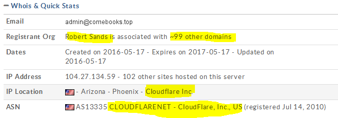 I fairly sure the Robert Sands listed above only exists on the internet. Especially since a reverse lookup on admin@comebooks.top found no connection to any domain.