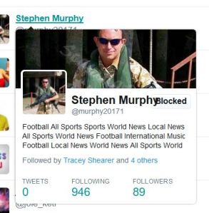 This time, now scarred, but wiser from my encounter with the good General (and the fact that Stephen pud-monkey Murphy had zero tweets,) I didn’t follow back, and was able to forgo showering with Lysol a second time…Yeah, me.