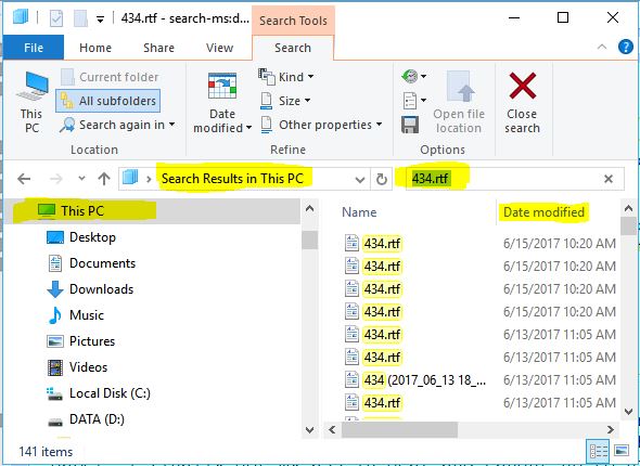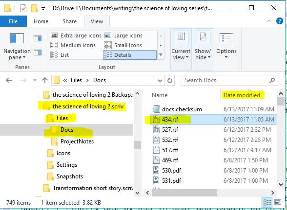 Fortunately, after much hand wringing and gnashing of teeth, I had an epiphany, and it was so obvious, I’m embarrassed that it didn’t occur to me sooner ( we’ll call it my ‘duh’ moment and never mention it again. ) If Scrivener’s auto-saves weren’t in the project or backup folder, they had to be somewhere else… So, in Windows File Explorer, I searched This PC for all files with names corresponding to the outdated one in the Scrivener project’s docs folder….